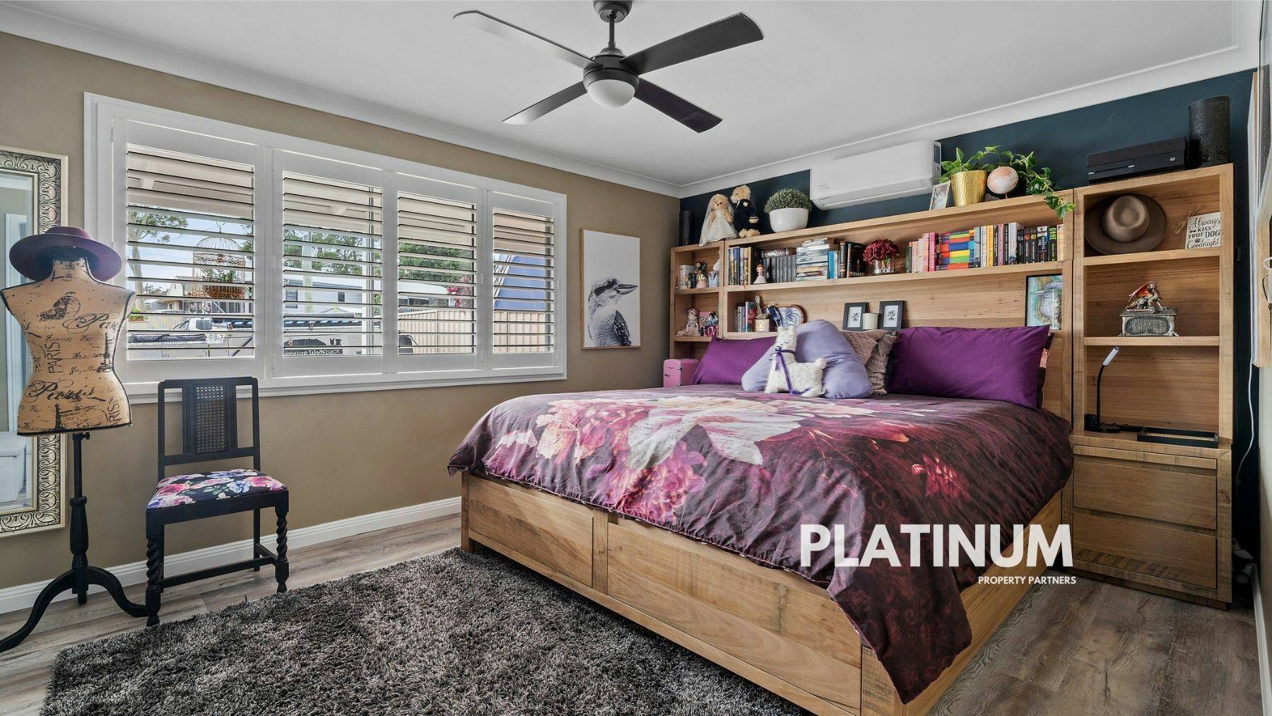 Now I know we say “generously sized” a lot…but that is truly an understatement when it comes to this master bedroom. It currently has a superking bed in there and still offers plenty of space to get around. It's huge! It also features plantation shutters, wardrobes, a split system A/C, a fan and a tv point. The second bedroom also offers a fan and plantation shutters and these are all serviced by the centrally located bathroom that offers new fixtures, a toilet, shower, and vanity.
