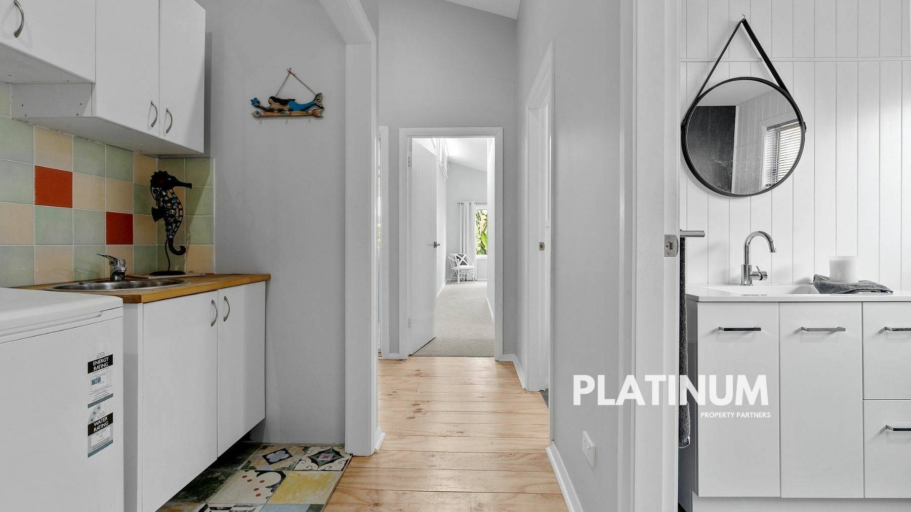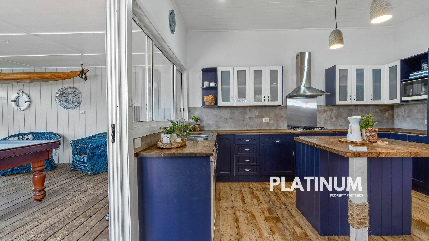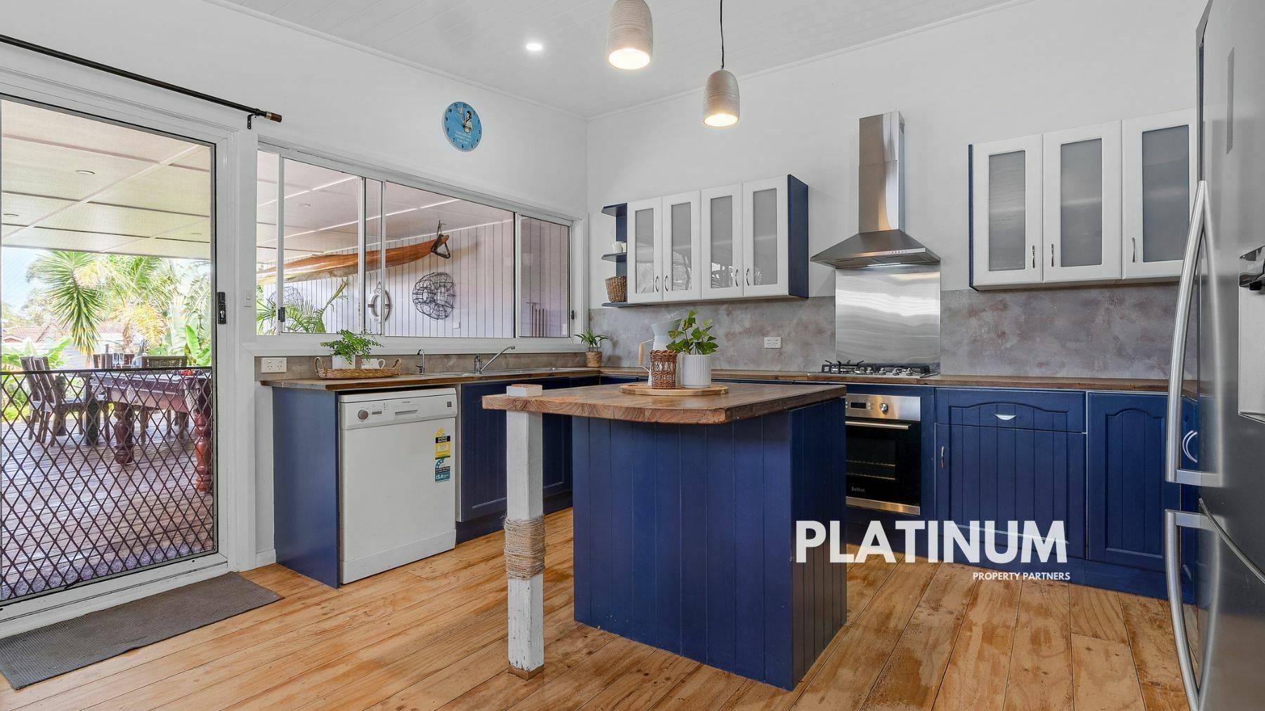 The recently renovated kitchen features an island bench, ample storage and bench space, hardwood bench tops, a dishwasher, gas cooktop, electric oven, double sinks and a large sliding window that could act as a servery to the outdoor entertaining area. Making entertaining an absolute breeze!