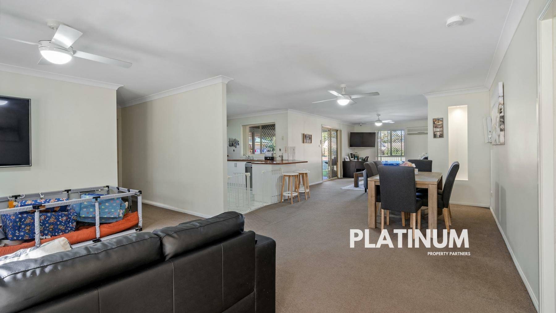 Then we enter the front door. This is when you may be surprised by just how large the home is. As you enter into a huge open plan living, dining and kitchen space. This has fresh carpet, downlights, paint and a split system A/C. This space is large enough to have two separate living areas or a living area and an office space.