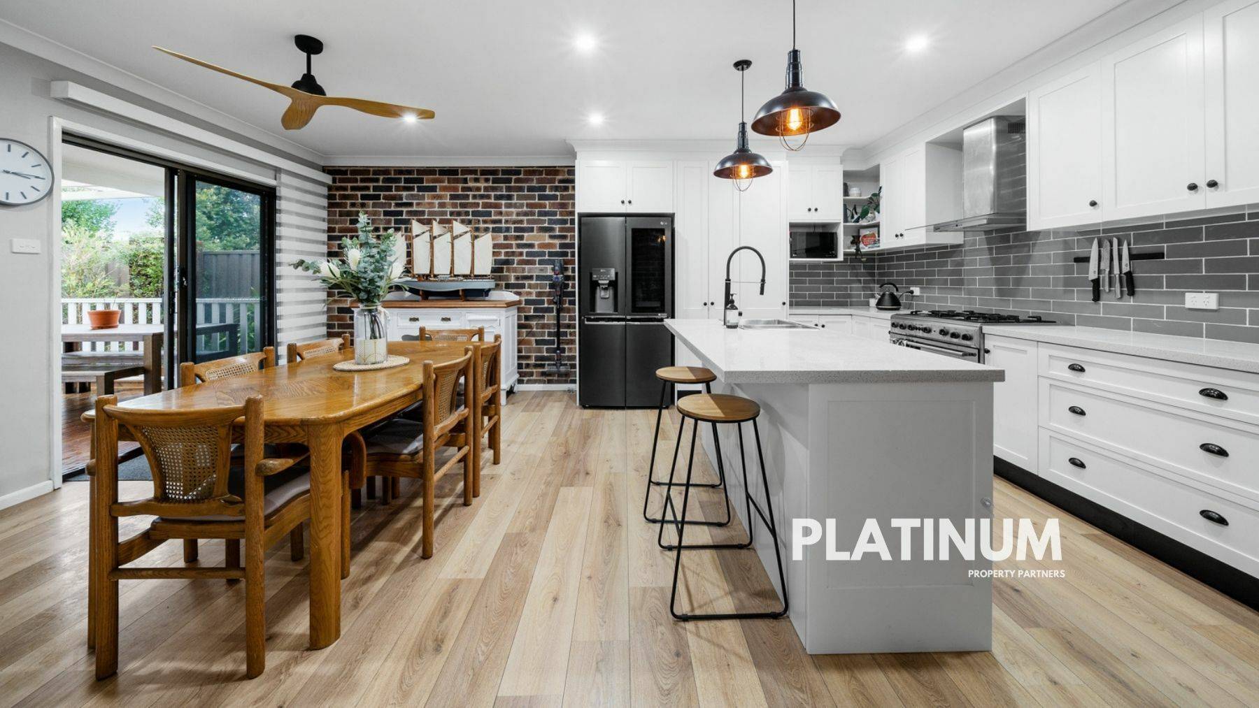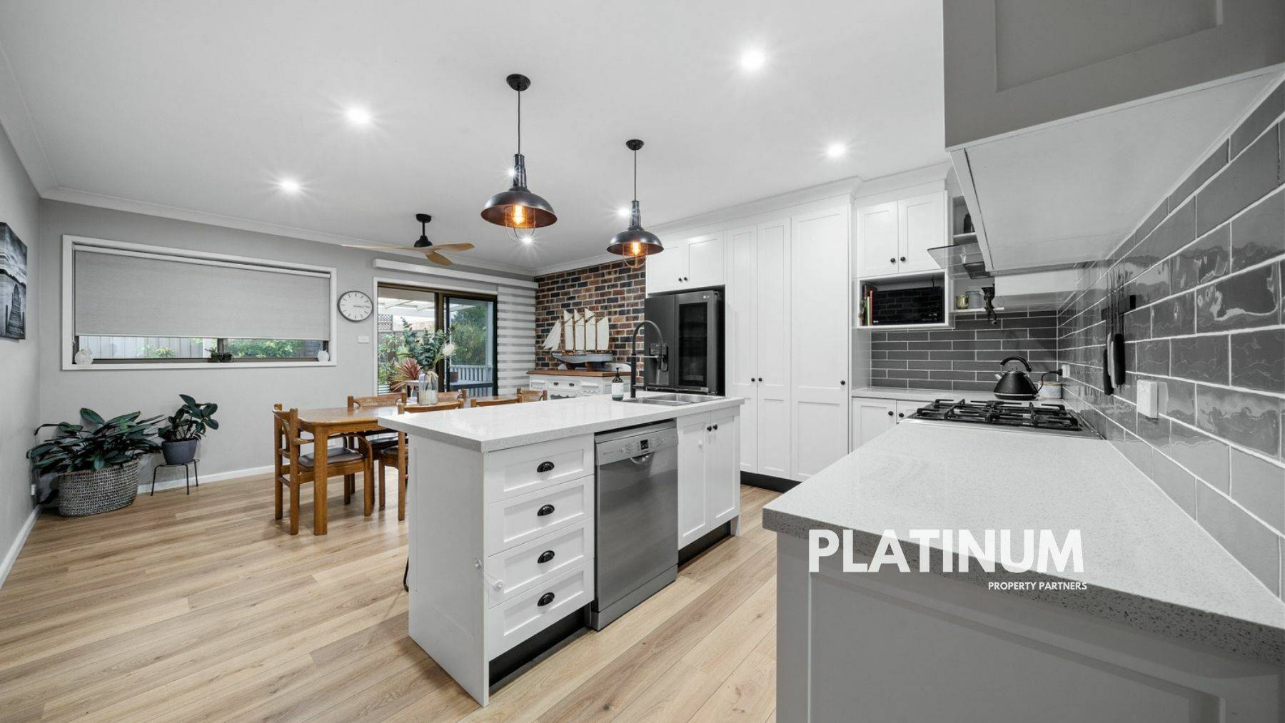 Next is the modern kitchen which is an entertainer's dream featuring stainless steel appliances, a sliding draw pantry, stone bench tops, 900 gas oven and an abundance of storage options. Floor to ceiling sliding glass doors provide seamless access out to the undercover entertaining area which compliments the manicured backyard.