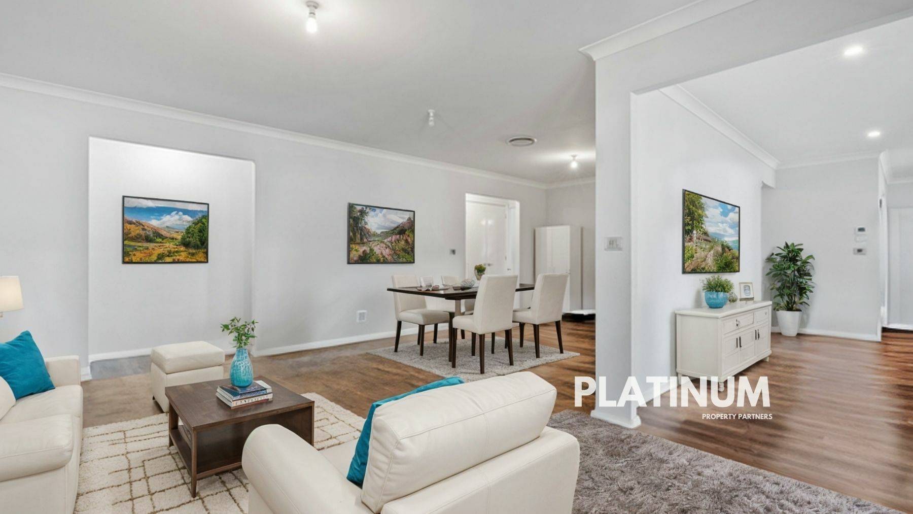 walk in wardrobe. The open plan kitchen seamlessly connects to the living and dining areas, creating