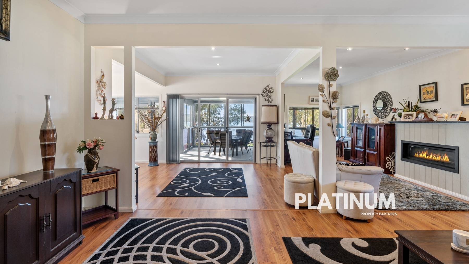 High ceilings and a sunken open plan living, dining, and kitchen space create a sense of grandeur and freedom. The kitchen, a culinary delight, comes complete with ample storage, electric cooking, double sinks, a dishwasher, and a walk-in pantry. Adjacent to the kitchen, the dining area flows gracefully, while the living space charms with a large gas fireplace and a cosy office nook offering mesmerising views.