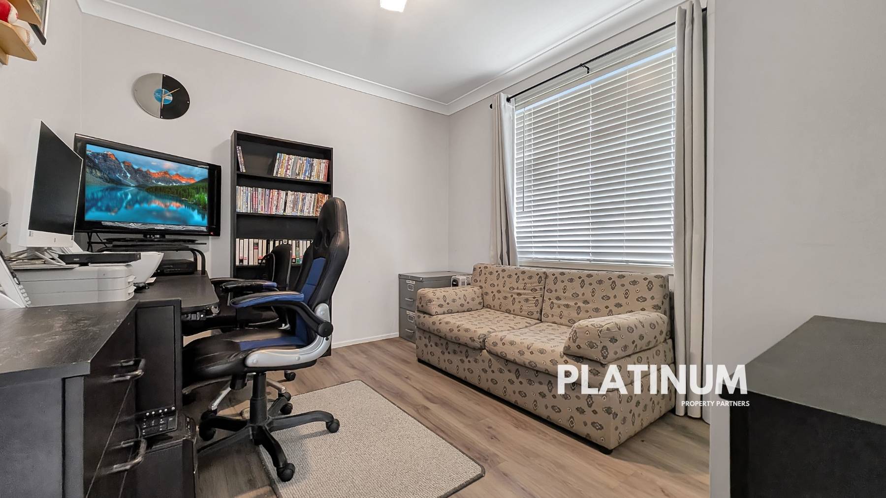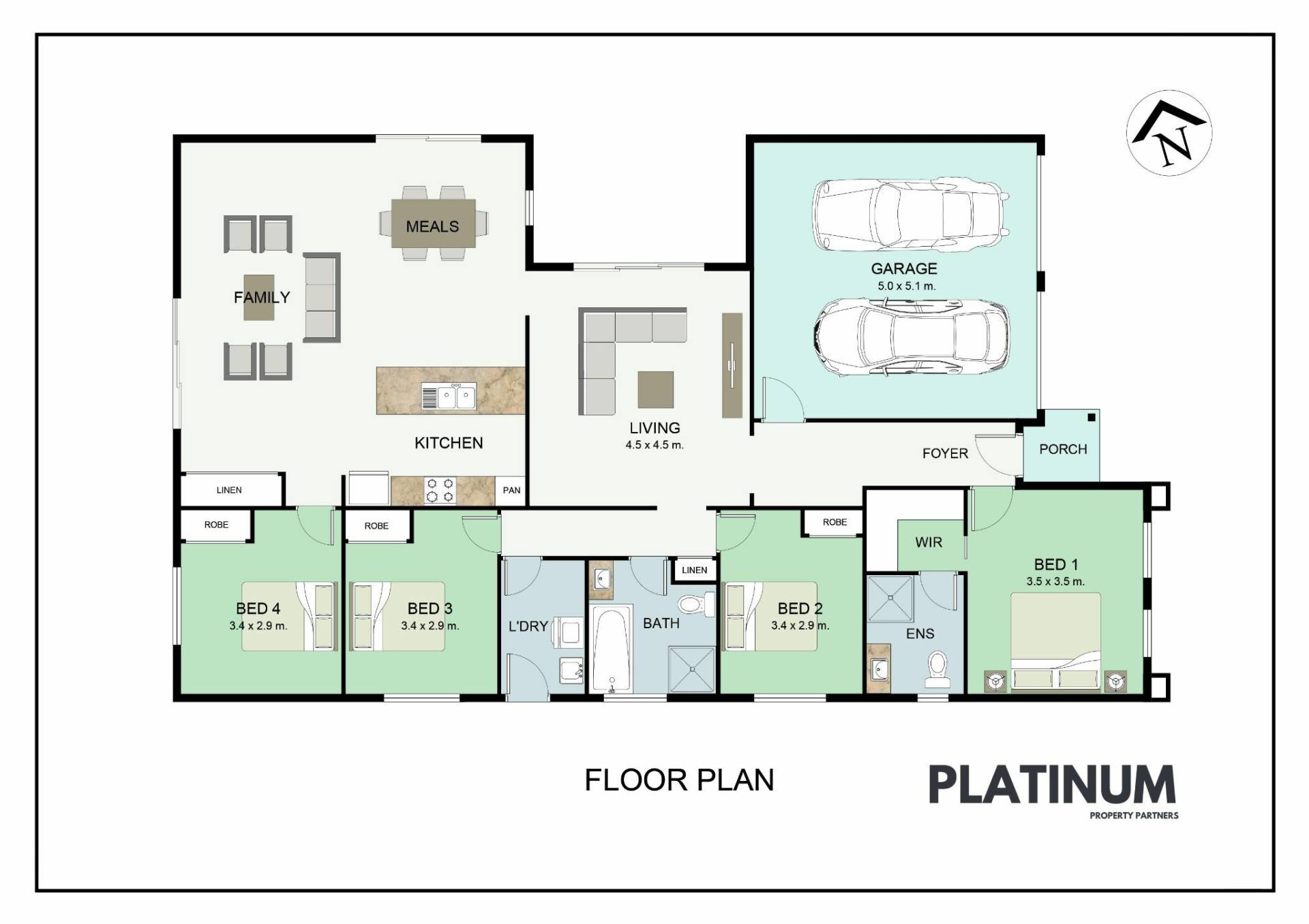 A flowing floor plan reveals multiple living spaces, including a central reading room that could serve as an additional living area, fostering a convivial atmosphere for family gatherings. The rear of the house unfolds into an open-plan living, dining, and kitchen space, equipped with modern necessities such as electric cooking, a dishwasher, and ample storage. The area is further enhanced by a split system air conditioner, ensuring year-round comfort.