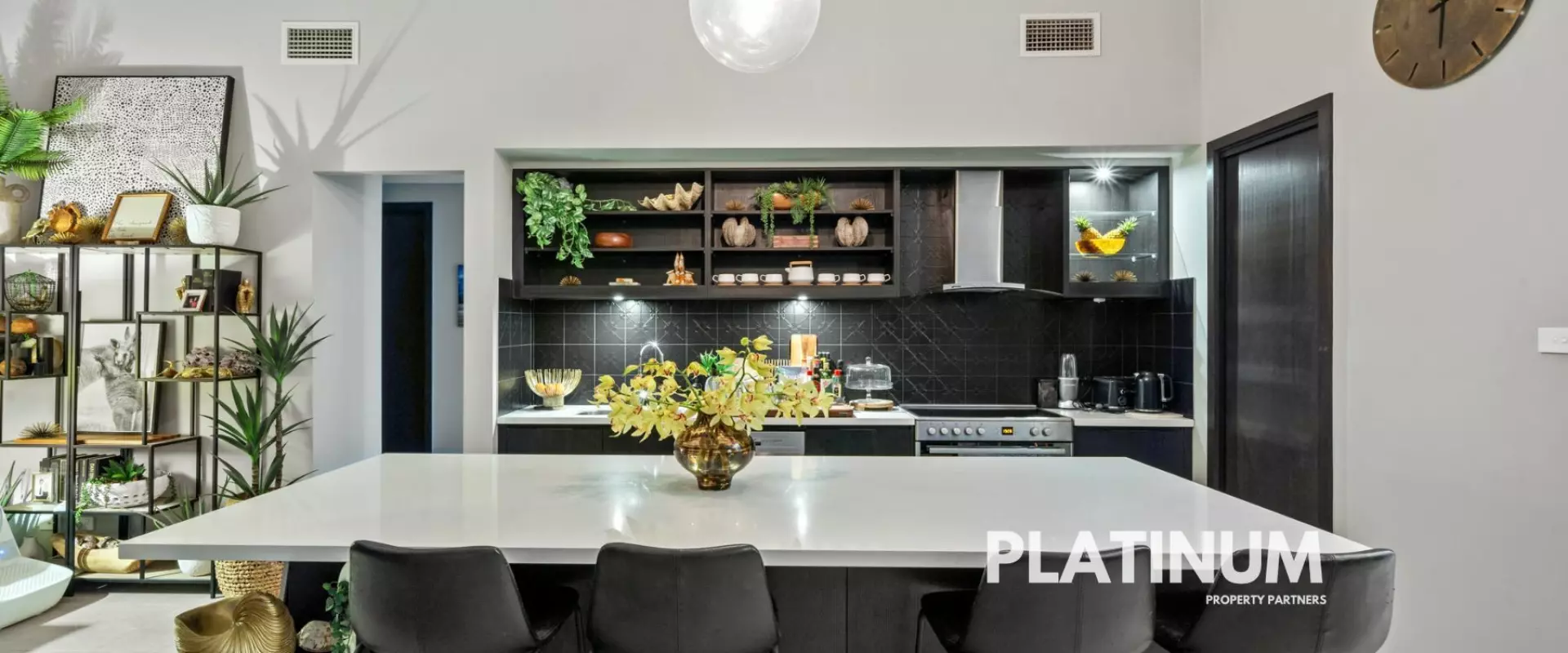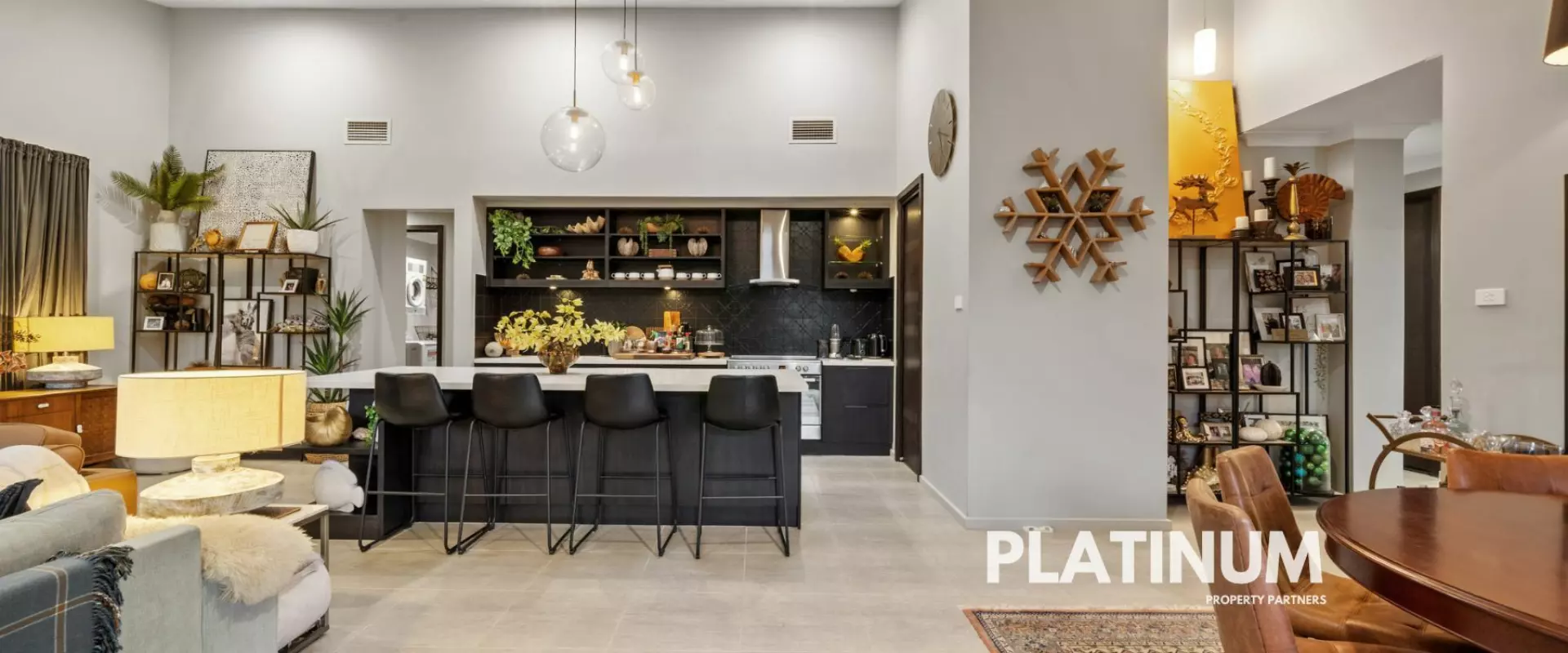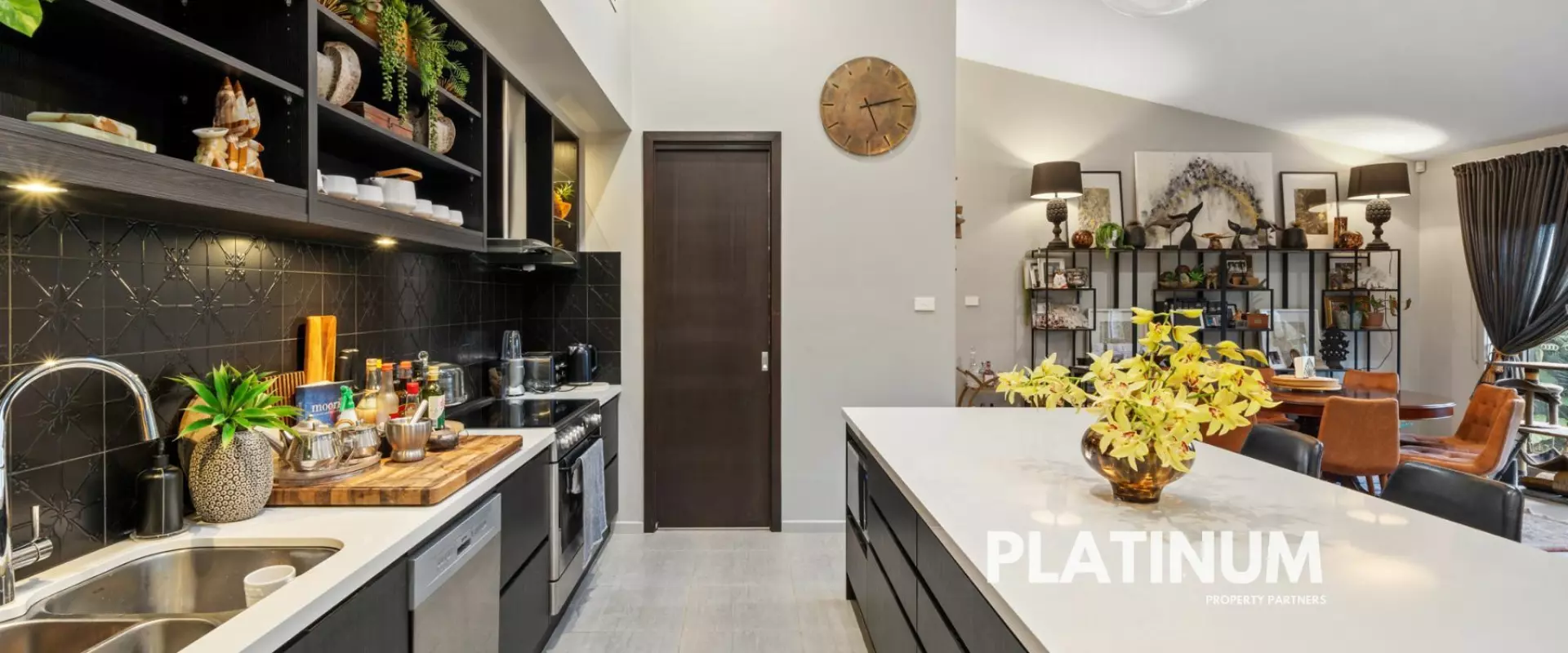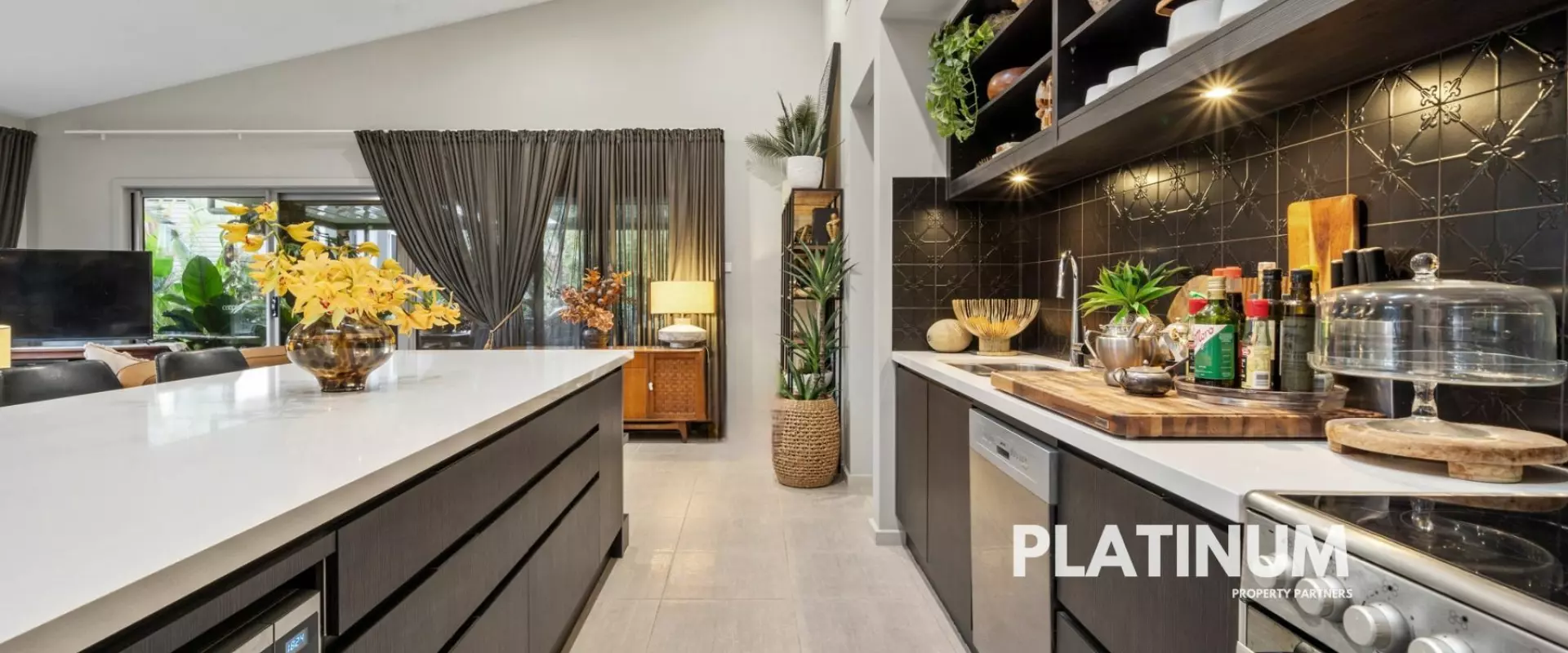 As you step inside the wide hallway that leads you to soaring high ceilings in the open-plan kitchen, living, and dining areas, illuminated by natural light streaming through skylights. Strong dark tones enhance the modern aesthetics, creating an atmosphere that is both sophisticated and inviting. The seamless flow leads you to your spacious entertainment zones, perfect for gatherings with family and friends.