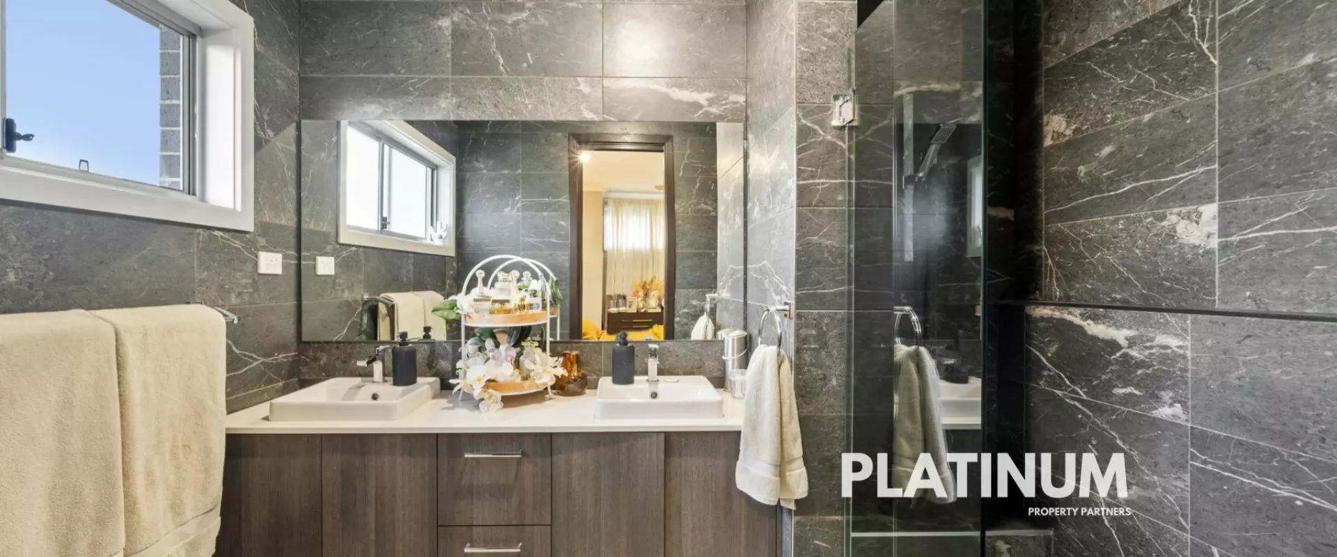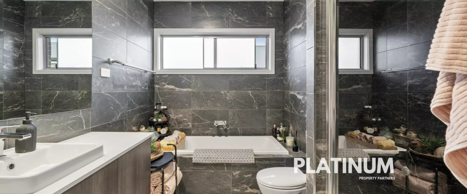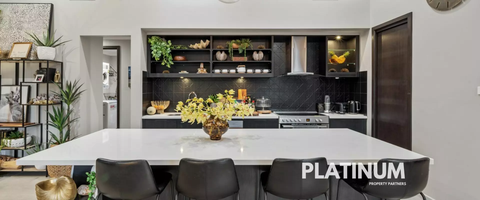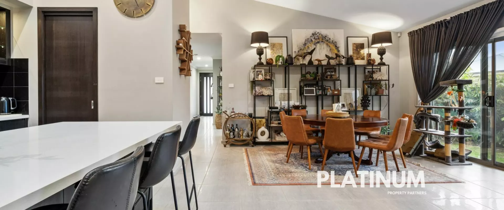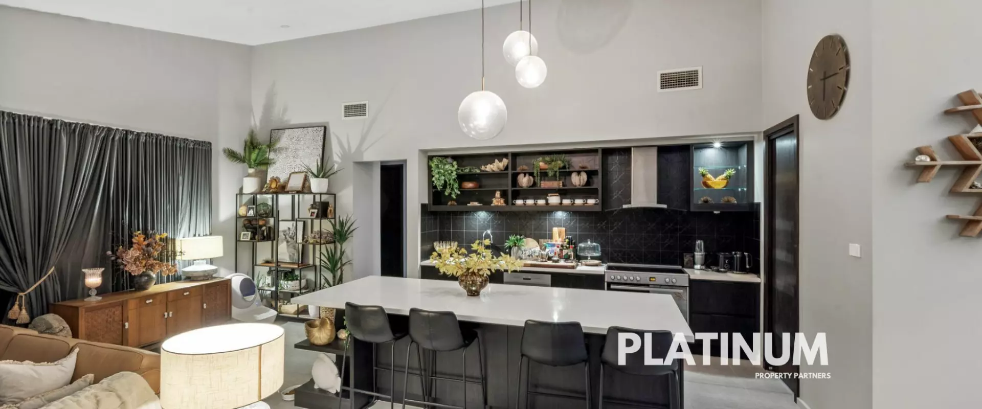 As you step inside the wide hallway that leads you to soaring high ceilings in the open-plan kitchen, living, and dining areas, illuminated by natural light streaming through skylights. Strong dark tones enhance the modern aesthetics, creating an atmosphere that is both sophisticated and inviting. The seamless flow leads you to your spacious entertainment zones, perfect for gatherings with family and friends.