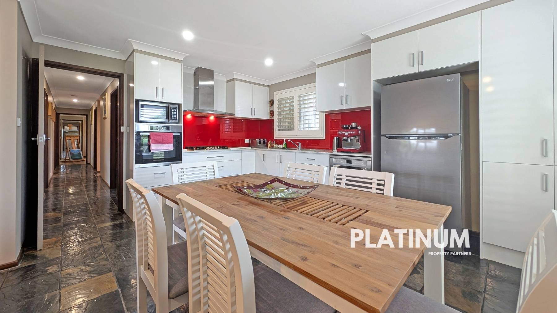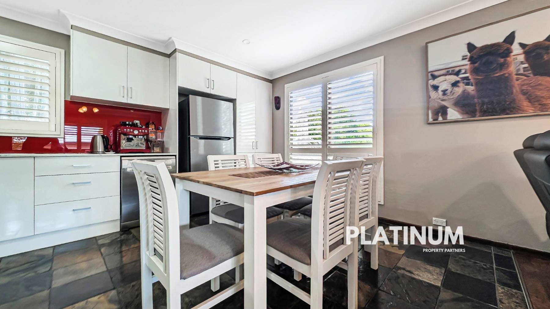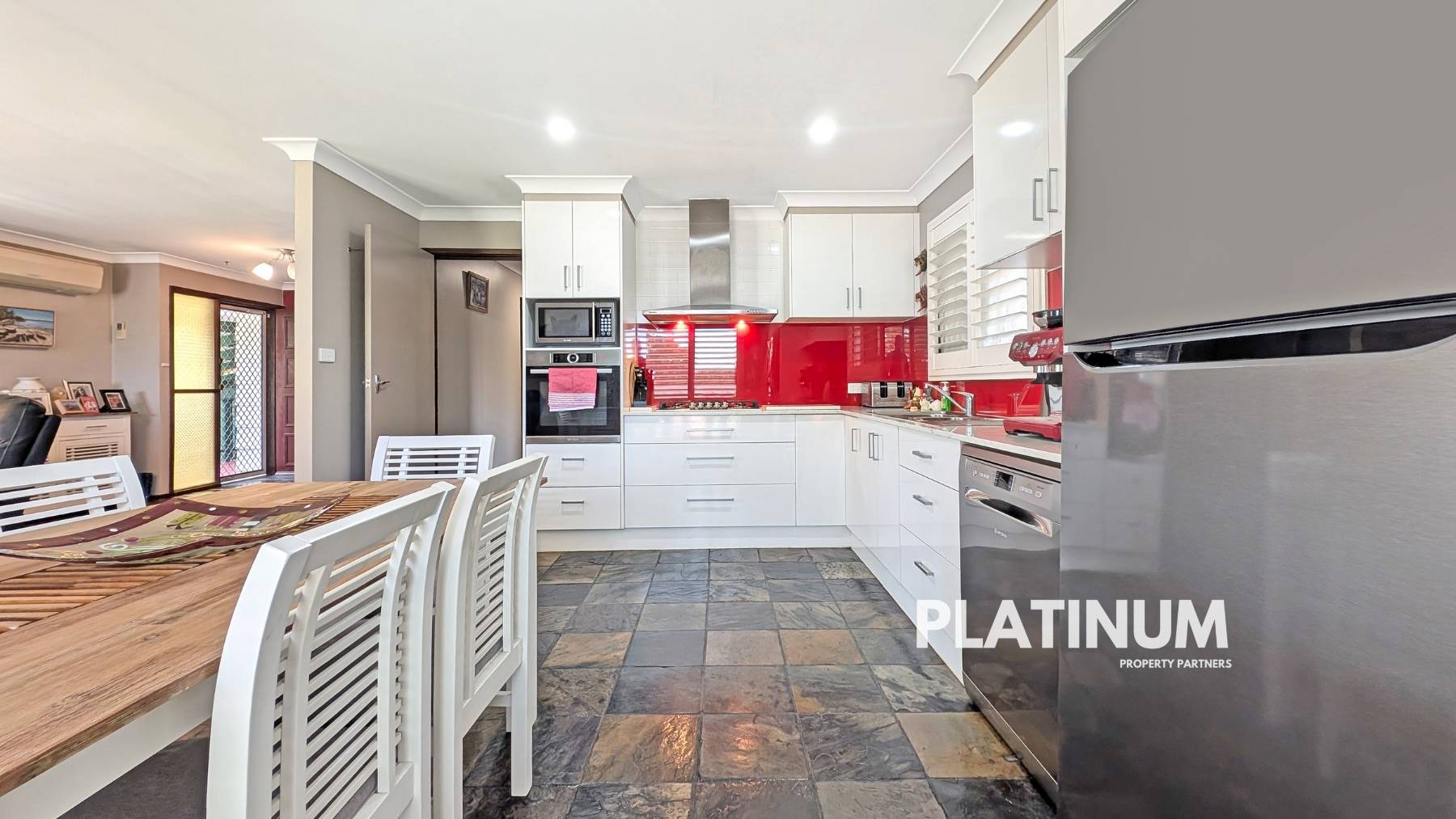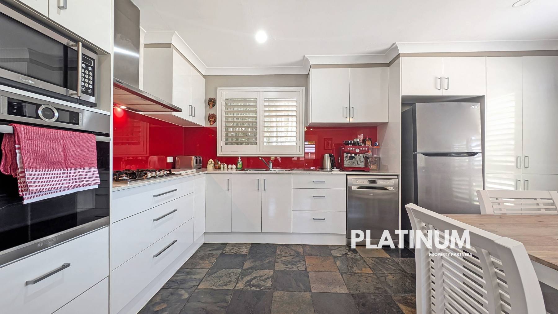 The heart of the home is undoubtedly its spacious and inviting kitchen, boasting stone benchtops, red feature splash back, a modern gas cooktop, dishwasher, and an impressive amount of storage, making it a culinary enthusiast's dream. Adjacent to the kitchen, the dining area seamlessly connects, creating a harmonious flow for entertaining guests or enjoying family meals.