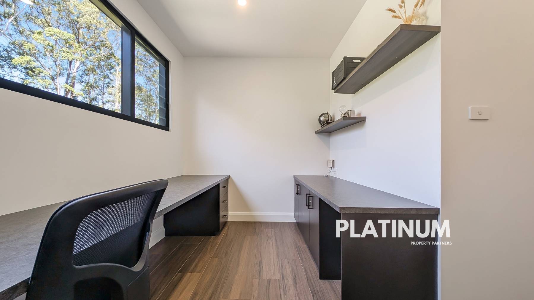 Luxury continues in the substantial master bathroom, with a hung vanity and under vanity lighting, wall-to-ceiling tiles, freestanding bath, and double shower heads. Ducted air conditioning ensures year-round comfort, while a media room and home office offer additional functional spaces.