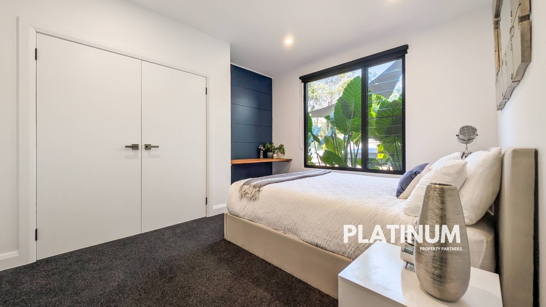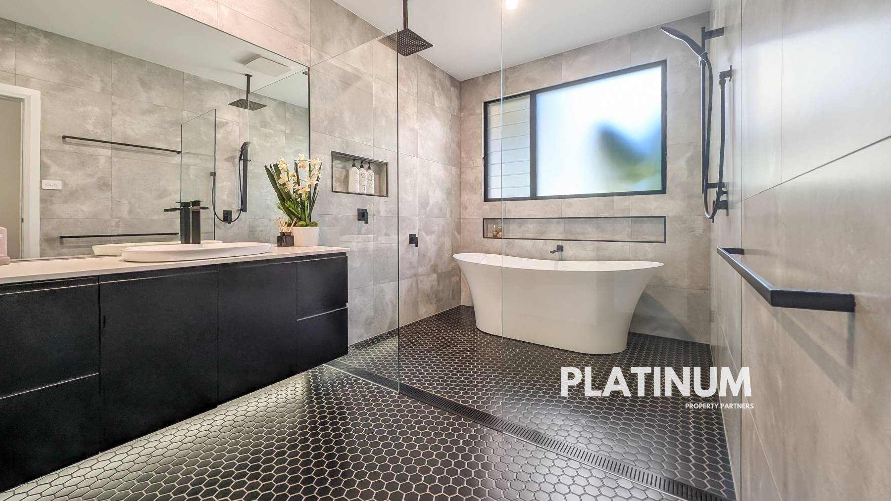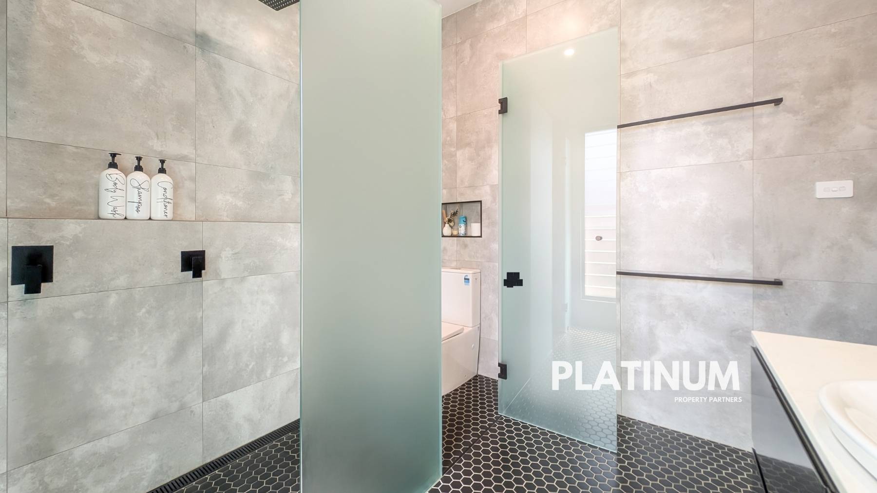 Four generously sized bedrooms provide ample space for family and guests. The master suite is an expansive retreat with a feature VJ board wall, walk-through wardrobe, and an ensuite with floor-to-ceiling tiles, hung vanity, louver windows, and a double shower, all privately set behind frosted glass. The remaining bedrooms are equally plush, featuring built-in wardrobes and soft carpeting.