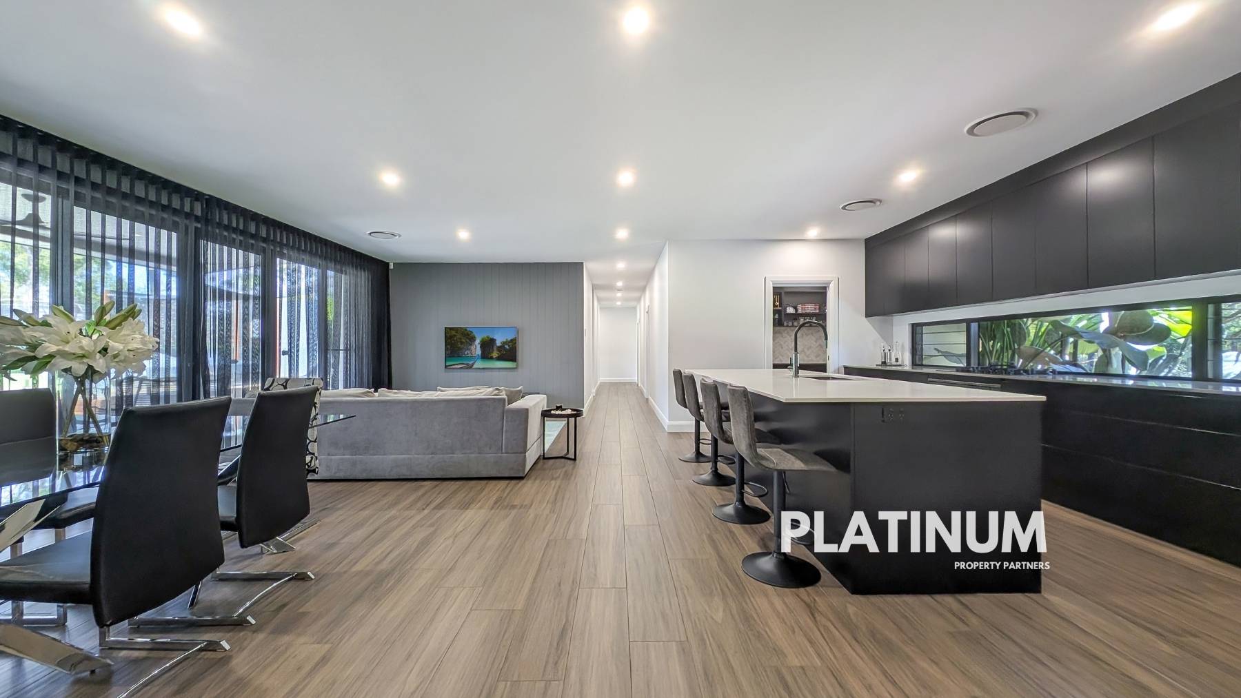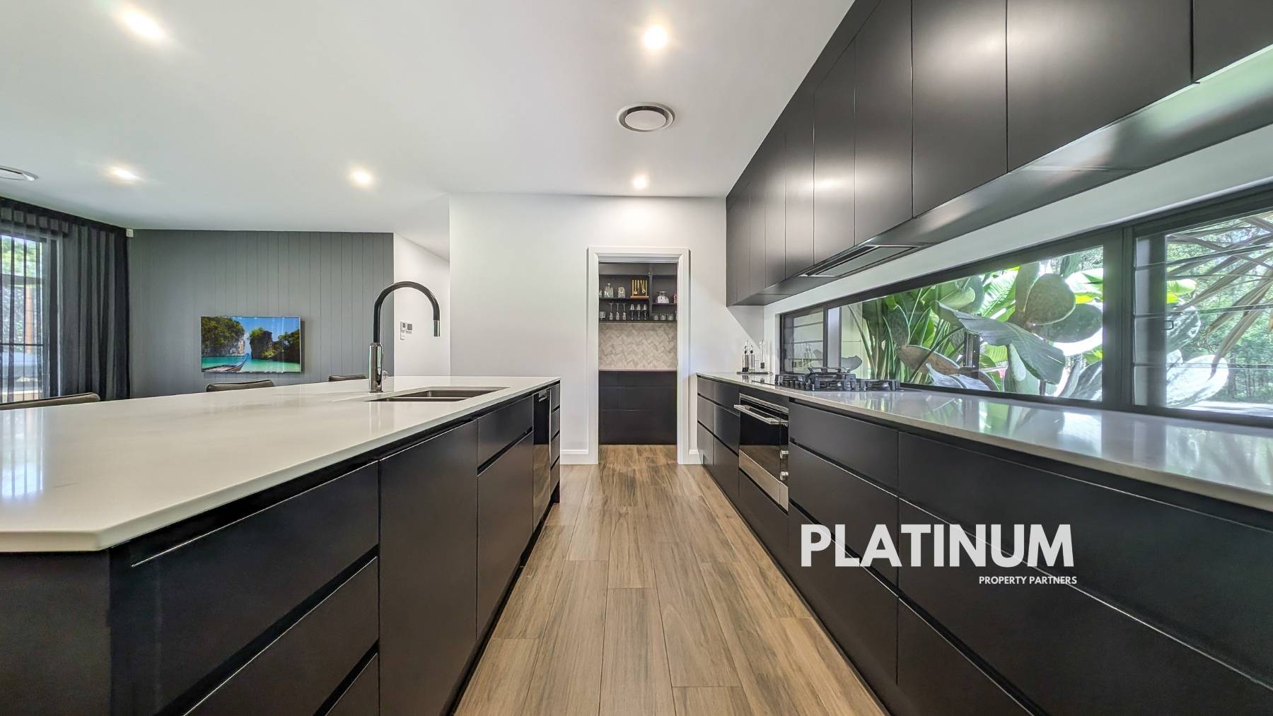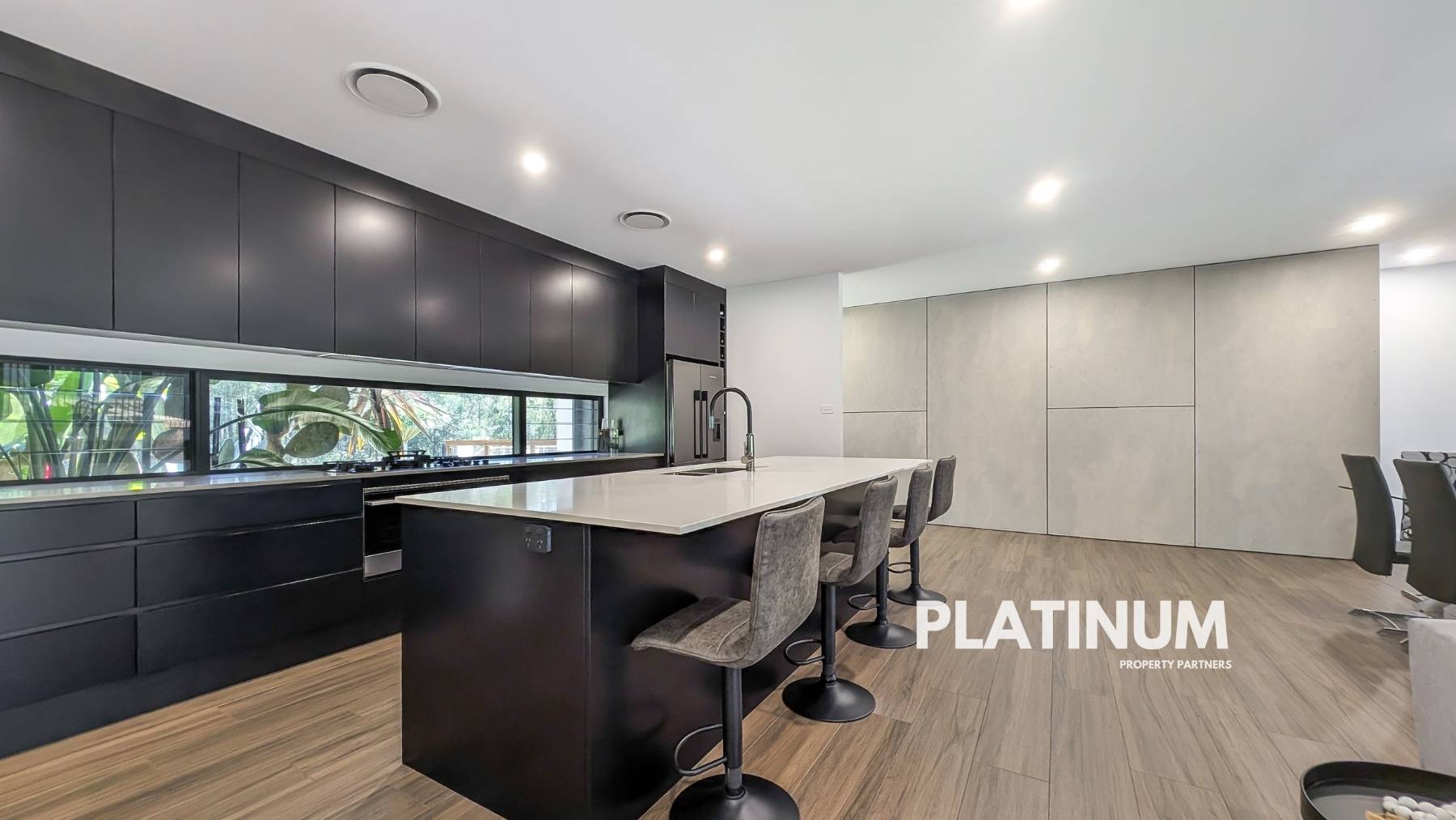Boasting high ceilings throughout, the heart of the home is the open plan living/dining and kitchen area. The kitchen is a chef's delight featuring a large island bench with an integrated sink, elegant stone benchtops, matt black cupboards, and ample storage. Gas cooking facilities and a butler's pantry with additional sink and stone countertops further enhance this culinary haven.
