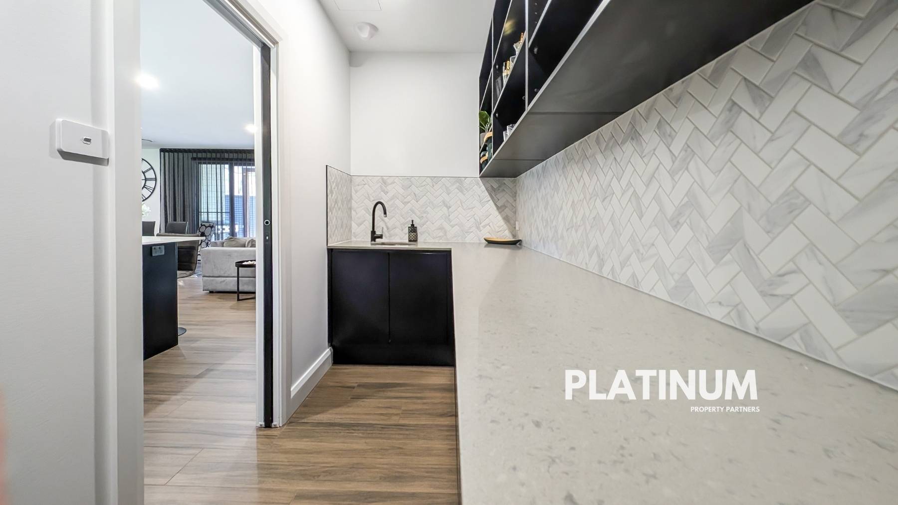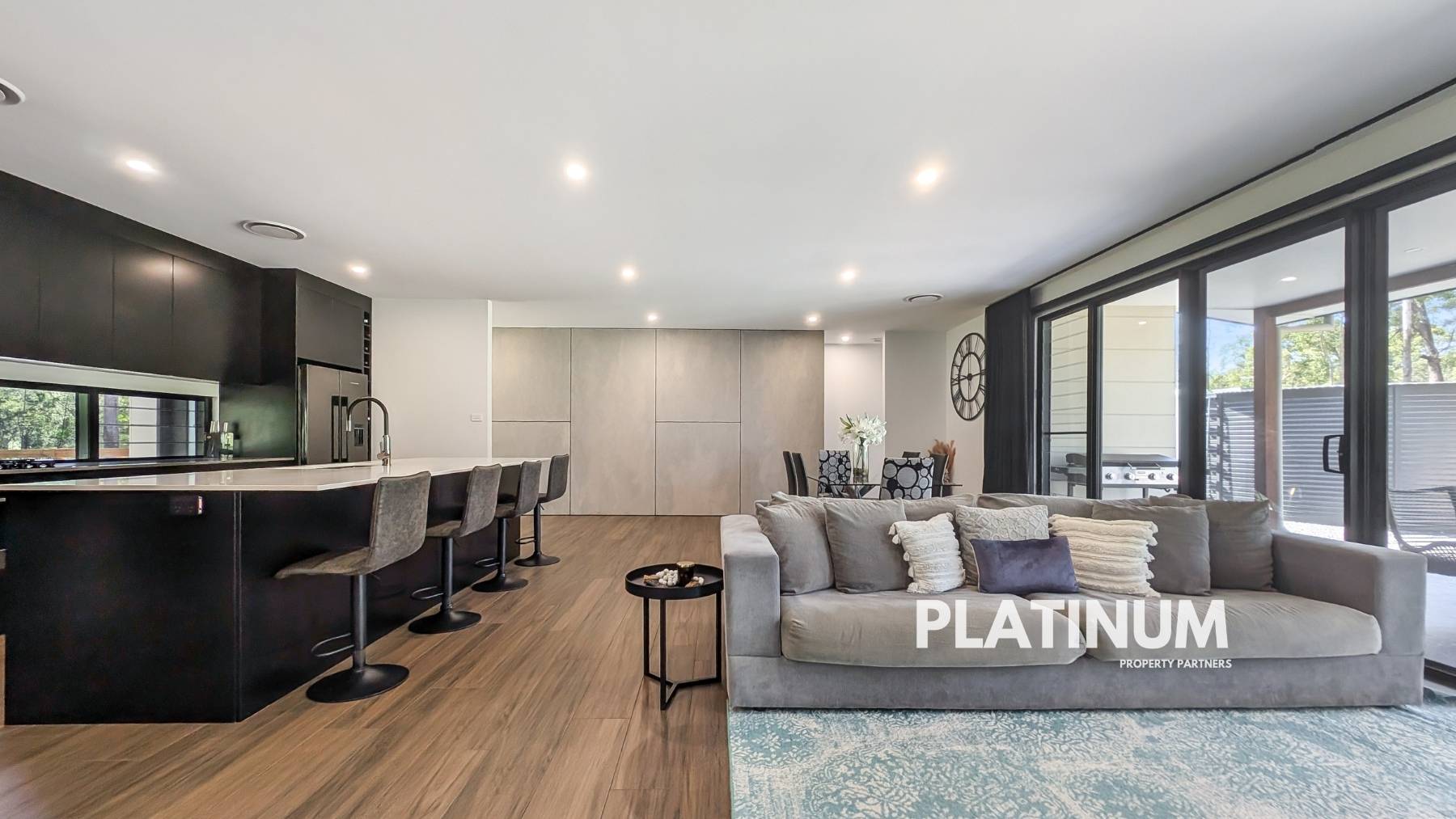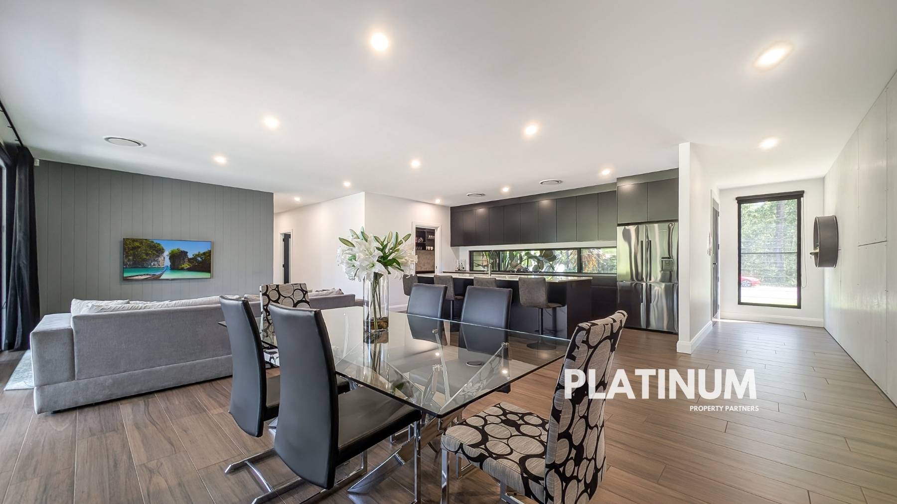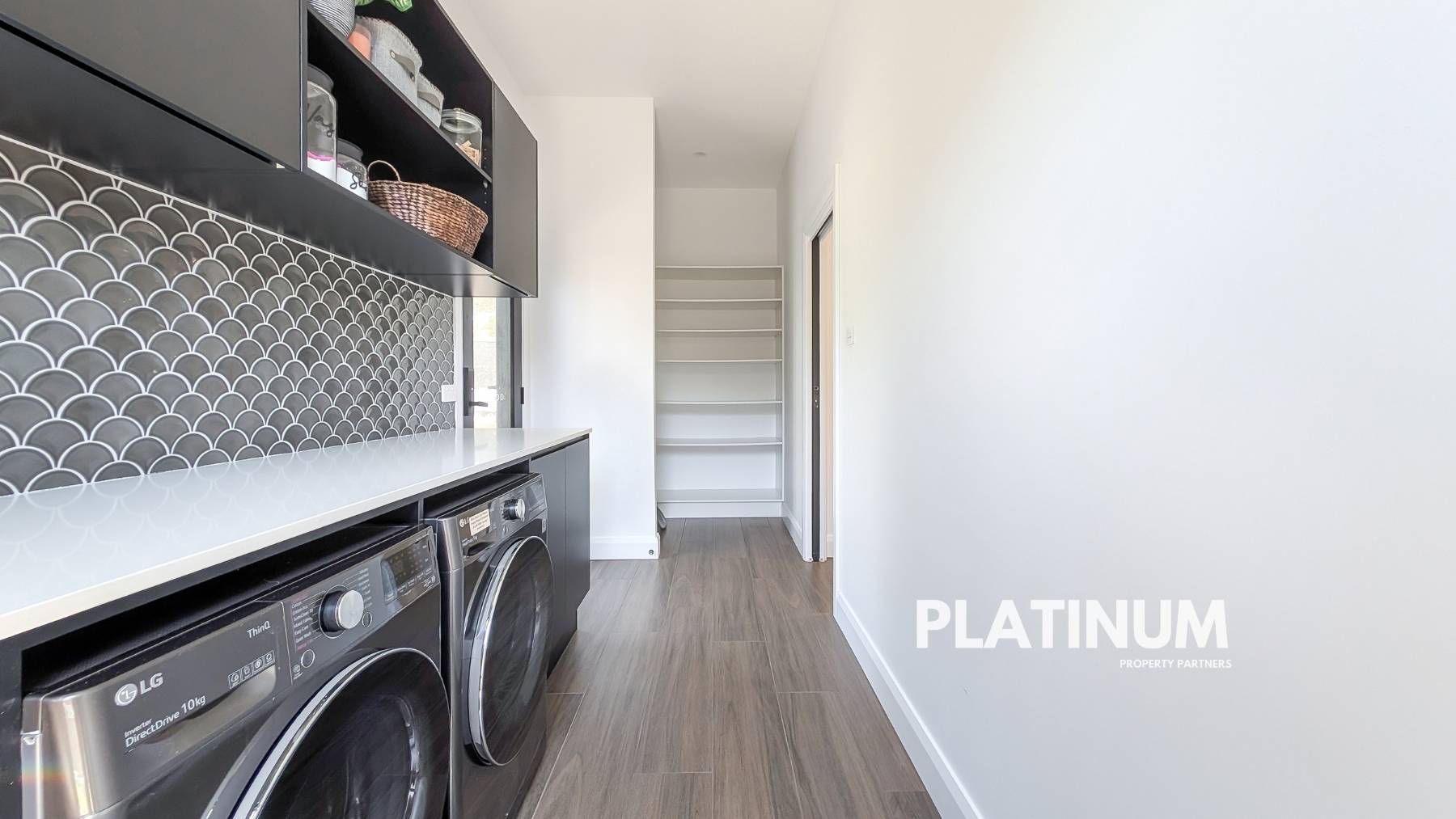 Boasting high ceilings throughout, the heart of the home is the open plan living/dining and kitchen area. The kitchen is a chef's delight featuring a large island bench with an integrated sink, elegant stone benchtops, matt black cupboards, and ample storage. Gas cooking facilities and a butler's pantry with additional sink and stone countertops further enhance this culinary haven.