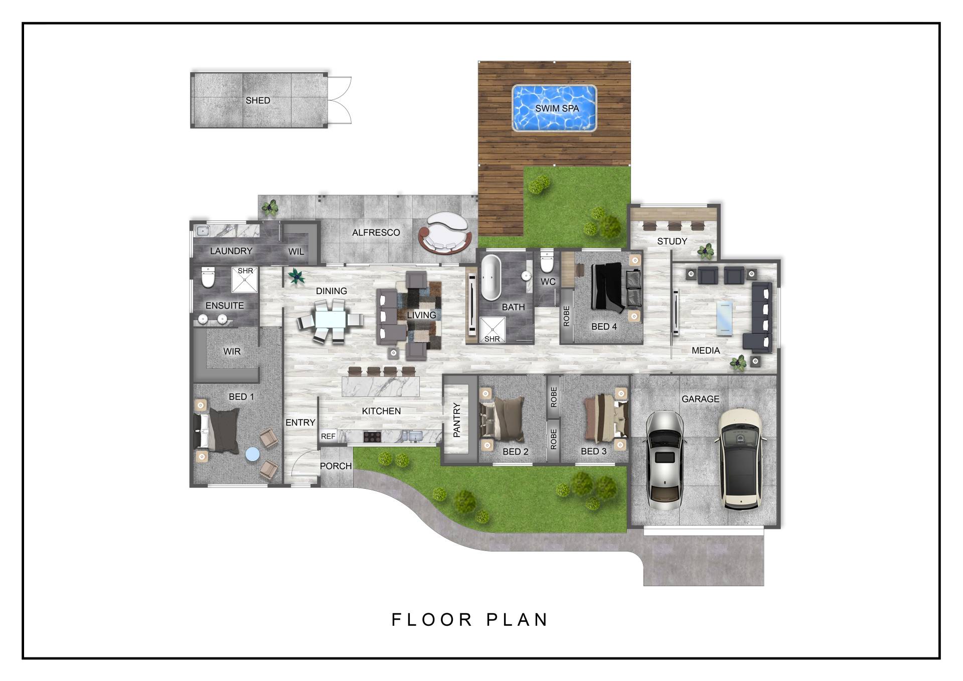 Outdoor living is a joy with the large undercover alfresco area complete with a ceiling fan, swim spa, and surrounding deck. The fire pit and manicured, fully fenced backyard are perfect for both relaxation and entertainment. An extra storage shed, alarm system, and external cameras provide added security.