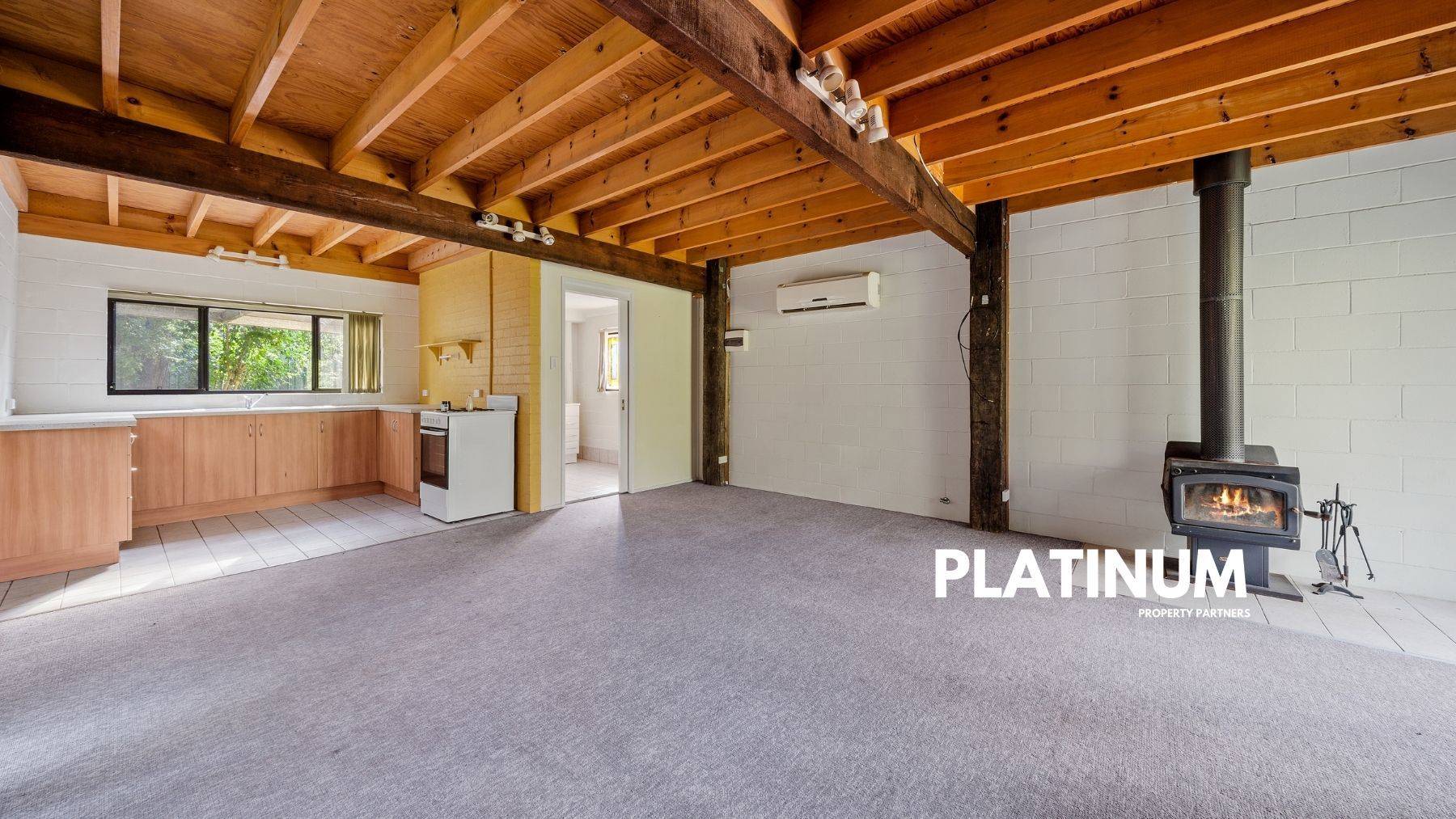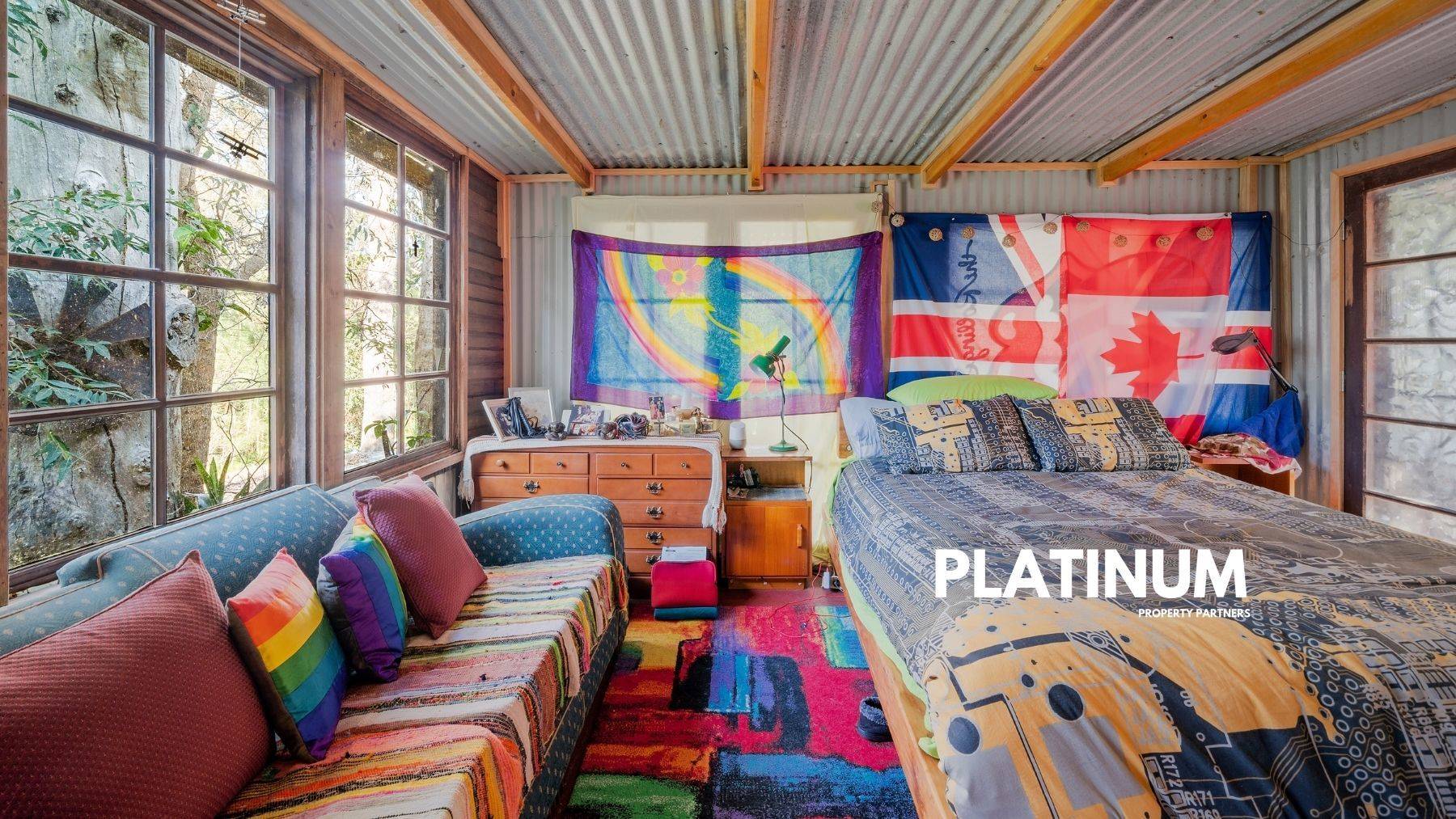 Moving further right we have Cabin 3: Slightly more private than the first two with a double colourbond gate entry and carport. As you enter, you have the Kitchen on the left and bathroom right next to it. We have wide open space with fireplace and aircon. Upstairs is another wide open space with bathroom, walk in wardrobe, fans and plenty of powerpoints.